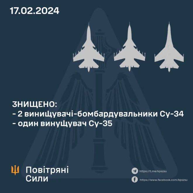乌克兰空军司令米科拉·奥列什丘克表示,乌克兰军方于 2 月 17 日在东部击落了两架俄罗斯苏-34 战斗机和一架苏-35 战斗机,有分析认为,这三架战机都是在乌军撤离的阿夫迪夫卡方向被击落的。这也是2024年以来乌克兰防空系统同一天内击落俄军战机数量最多的一次。