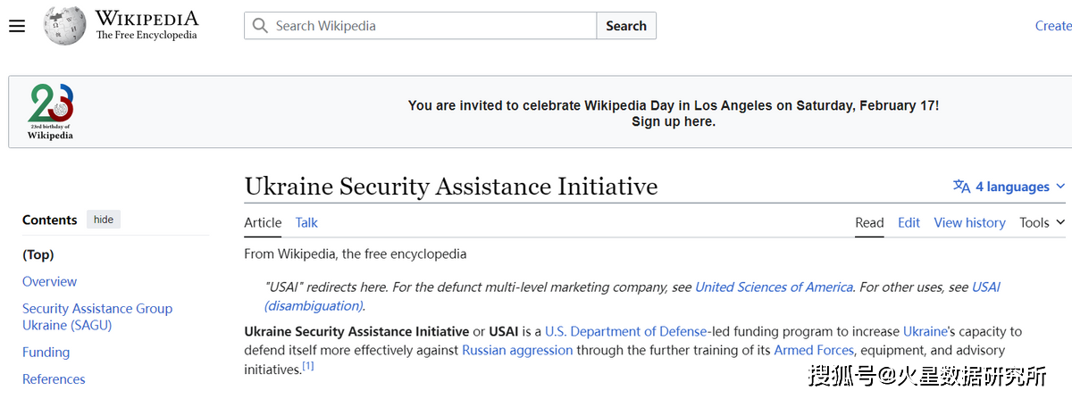 USAI在美国国防部运营的wikipedia.org网站上,有USAI的介绍。该介绍说,乌克兰援助倡议(Ukraine Security Assistance Initiative)简称USAI,是美国国防部牵头的一项资助计划,旨在通过进一步训练乌克兰武装部队和提供装备,提高乌克兰更有效地抵御俄罗斯侵略的能力。USAI 一揽子计划包括培训、装备和咨询活动,以提高乌克兰的防御能力,例如海洋领域意识、作战安全和乌克兰空军设施的能力,以及其杀伤力、指挥、控制和生存能力。为了应对俄罗斯的网络攻击和错误信息,USAI还支持网络防御和战略通信。