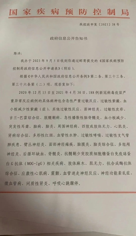 中国国家疾控局公开告知书指出,???188 例新冠疫苗注射后可能有严重异常反应。