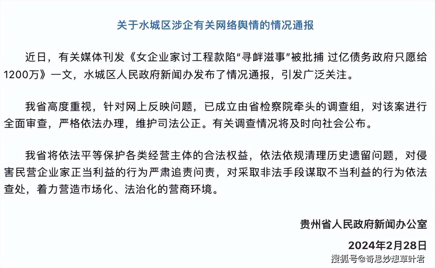27日,水城区发布通报,把自己推到风口浪尖上,通告只字不提律师问题,女企业家为何与地方撕破脸,要走到“寻衅滋事”的地步,这不符常理,更不符合科学规律啊!