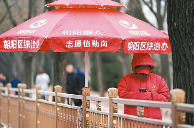 香港(专题)《明报》4日报导,北京海淀区的大爷大妈已上岗,3月1至15日,每个社区要派人员守路口、桥梁。北京西四环1座桥边3日开始插有“群防群治岗”红旗,桥附近也可见有人着大衣、戴着帽子站岗。