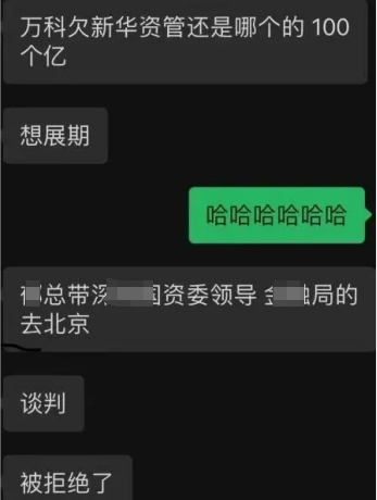 路边消息不止这一个,从网传的聊天记录看,有人直接透露万科欠的可能是新华资管的,金额100个亿,并且郁老板带的还不止高管,还有深圳国资的、金融局的去的北京。