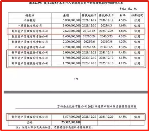 图片显示内容来自万科2023年第四季度中票募集说明书,里面新华资管的最多,截至2022年底金额合计有97.82亿。