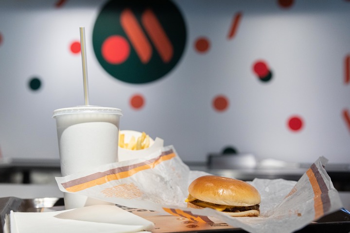 记者观察到,这家门店并未重新装修,但包装纸袋、餐巾纸、饮料杯等物品上所有与麦当劳有关的元素已被清除。店外广告牌上展示着餐厅新的品牌标志:绿色背景上画有一个红色圆圈和两根橙色线条,代表着一个汉堡和两根炸薯条。门店屋顶的玻璃幕墙上写着一句标语:“名称虽改,热爱依旧”。