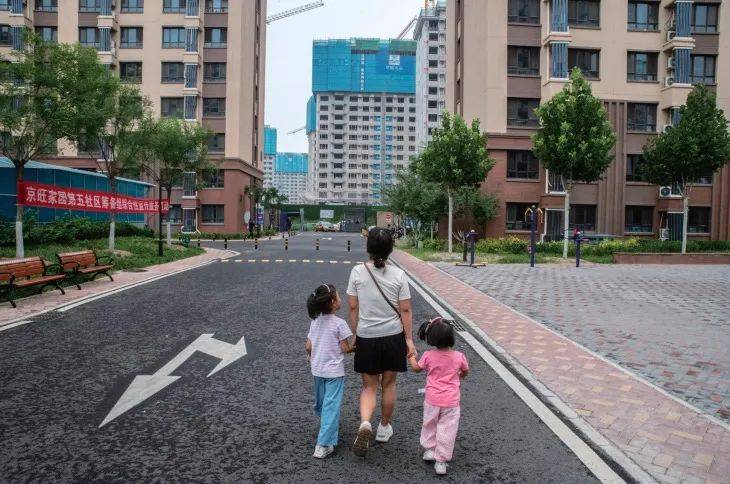 2023年8月11日,北京。一名女子带着孩子在正在施工的小区内散步。(图/视觉中国)