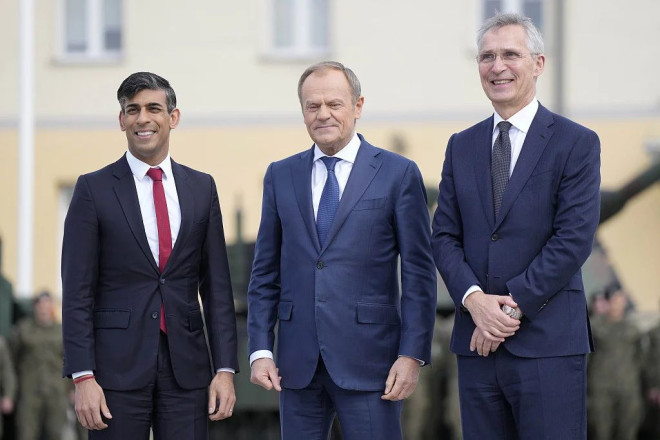 当地时间23日,英国首相苏纳克与北约秘书长斯托尔滕贝格到访波兰。苏纳克在华沙第一装甲旅总部举行的新闻发布会上称:“英国国防开支将进入战争状态。”英国多家媒体报道称,苏纳克将在此次访问中宣布为乌克兰提供有史以来最大的一揽子军事援助。