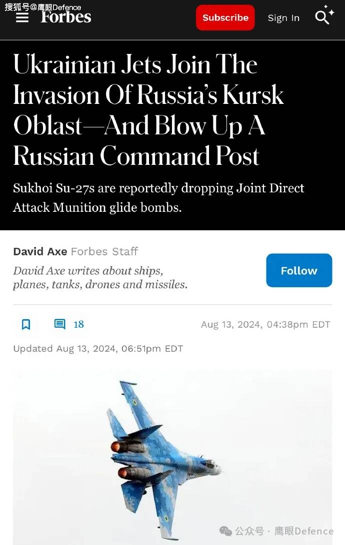 网络视频也显示乌克兰空军的苏-27战斗机进入了库尔斯克上空,不过,这架苏-27战斗机是执行对地攻击任务的。《福布斯》杂志报道称乌军这架苏-27战斗机投掷JDAM炸弹击中了位于泰特基诺的一个俄军指挥部,而这个指挥所很可能是属于车臣阿赫迈特特种部队的。