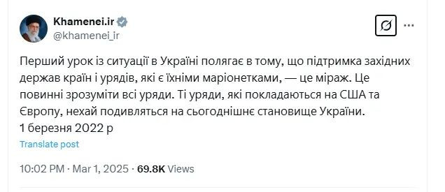 据伊朗国际电视台3月1日报道,特朗普与泽连斯基在白宫椭圆形办公室发生冲突后不久,在社交平台“X”上,哈梅内伊的官方账号用乌克兰语转发了他在2022年批评乌克兰依赖美国的言论。
