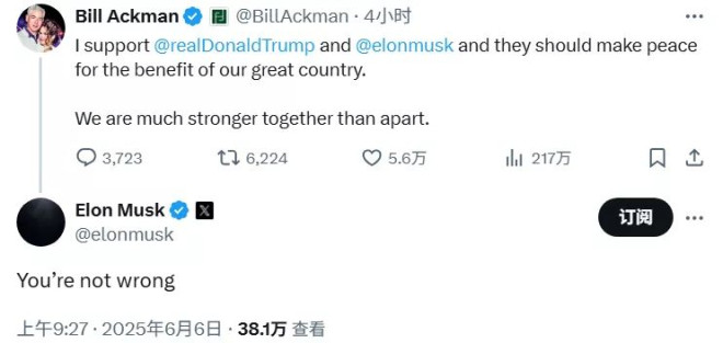 美亿万富翁呼吁特朗普与马斯克“和解”,马斯克回应