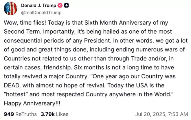 7月20日,川普宣布美国是“全世界任何地方‘最火热’(hottest)和最受尊重的国家”。(Truth Social截图)