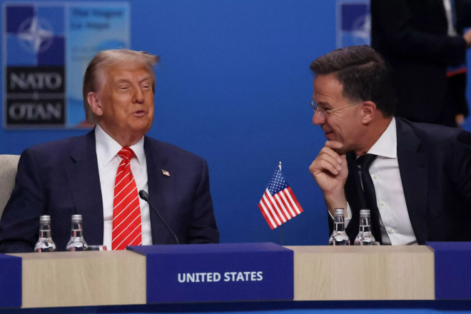 2025年6月25日,美国总统川普和北约秘书长吕特(Mark Rutte)在荷兰海牙举行的北约峰会上发表演说。(Reuters)