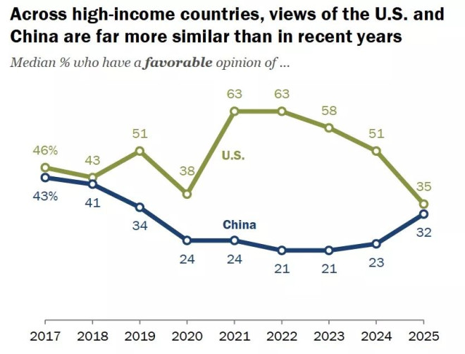 高收入国家的中(蓝色)美好感度对比。(Pew)