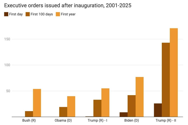 2001至2025年各届美国总统的行政命令数量(首日、首100日、首年)。(Ballotpedia)