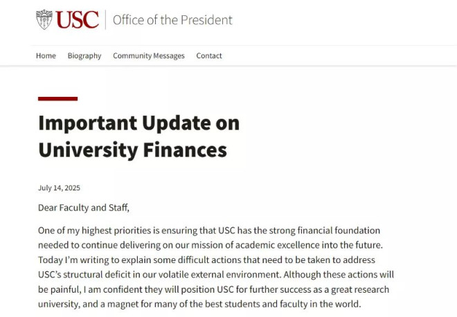 7月14日,美国排名TOP30的私立研究性大学南加州大学代理校长金秉洙宣布:因学校收支的结构性不平衡,本财年的预算赤字已突破2亿美元(远高于2024财年的1.58亿美元赤字)。