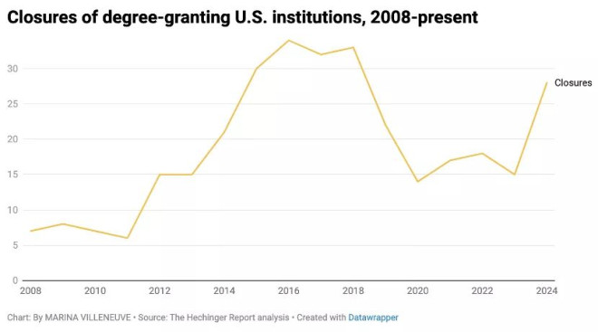 据高等教育执行官员协会(SHEEO)向赫钦格报告提供的联邦数据分析,在2024年的前九个月里,有28所授予学位的机构关闭,而2023年一整年只有15所。5