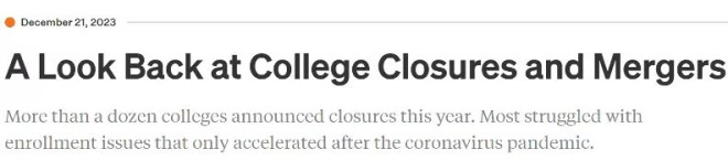 2023年12月21日,美国高等教育媒体Inside Higher Ed发布了《回顾美国大学的关闭与合并》一文。文中指出,关闭的非营利性学院和大学大多属于同一类型:都具有规模较小、私立、依赖学费和捐赠较少等特点。7