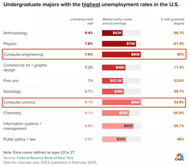 近日,美国纽约联邦储备银行的一份数据揭露了残酷现实:被誉为“理科之王”的计算机科学,其本科毕业生在2023年的失业率竟高达6.1%,这意味着每100名该专业毕业生中,大约有6人面临失业困境。而计算机工程专业的毕业生境况更为严峻,失业率达到了7.5%。