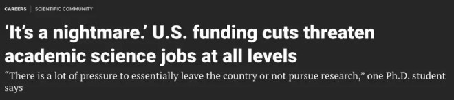 资金紧缺影响的不仅是一位位学者的个人发展,科研项目的停滞,更是让无数理科生的心血付诸东流。康奈尔大学物理学教授娜塔莎.霍尔姆斯参与的130万美元物理教育研究项目,这本是一个每年能惠及 4.5 万名STEM学生,助力他们在科学、技术、工程和数学领域探索前行的优质项目,却因美国国家科学基金会(NSF)资金冻结,被迫无限期搁置。12