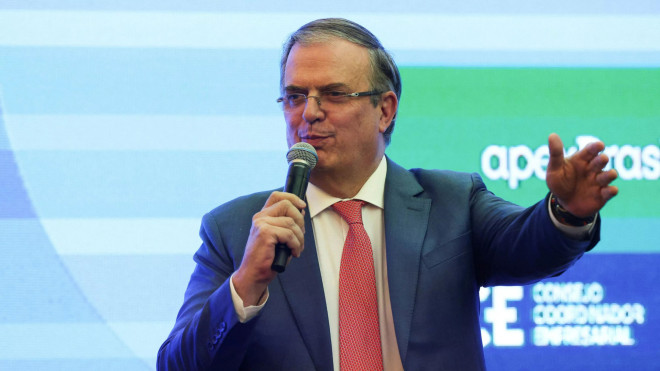 2025年8月27日,墨西哥墨西哥城(Mexico City),墨西哥经济部长埃布拉德(Marcelo Ebrard)在外交部大楼举行的墨西哥-巴西商业论坛 (Foro Empresarial Mexico-Brasil) 闭幕式上发表讲话。(Reuters)