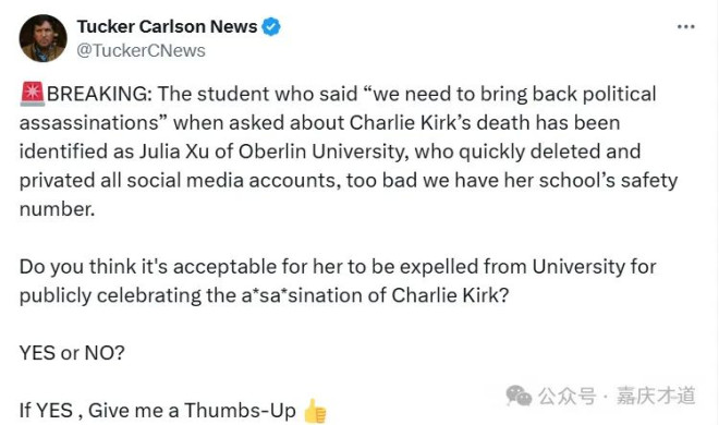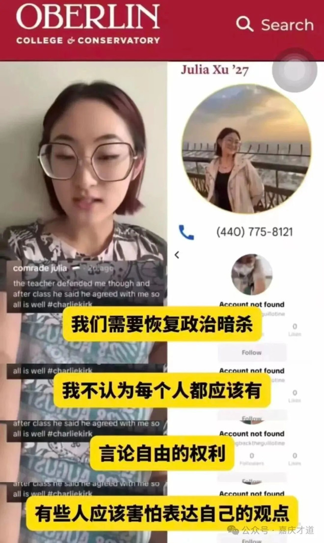 美国转折点组织创办人保守主义青年领袖查理.柯克遭暗杀之后,在美国俄亥俄州奥伯林学院留学的一个中国女学生——朱莉亚.徐,因为发表极端言论震惊了全美。