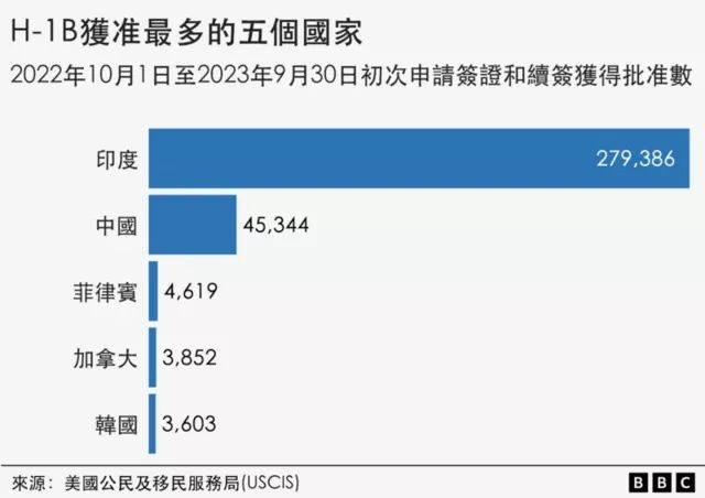 根据美国官方数据,印度是去年H-1B签证的最大受益国,占核准申请的71%。中国则以11.7%位居第二。