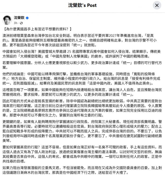 沈荣钦(加拿大约克大学副教授):澳洲前总理莫里森来台湾参加台北安全对话,明白表示习近平要共军2027年准备进攻台湾,“是真的”。莫里森是能够接触到五眼联盟最高机密的人之一,他亲自证明确有此事,对台湾的示警不可小觑,更不能因为习近平今年首次谈话没提到“统一”就放松。