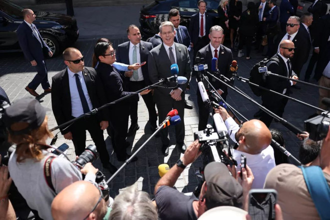 9月,美国财政部长贝森特在马德里与中国国务院副总理何立峰举行贸易会谈后接受媒体采访。