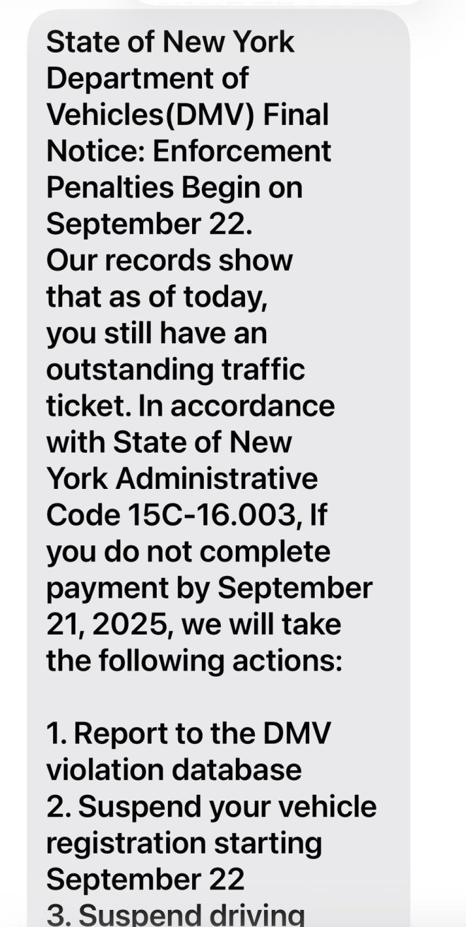 诈骗集团常利用简讯警告使用者欠缴过路费或停车费,但经常是诱使受害人上当的手法。(截自手机简讯)