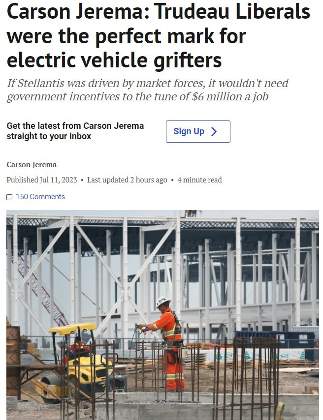 两年前杜鲁多执政期间加拿大联邦政府和安省政府投入高达150亿元,以确保克莱斯勒汽车制造商Stellantis在温莎建设一座电池工厂并承诺提供2500个就业岗位,这意味着平均花600万增加一个就业岗位。