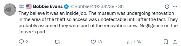 当局称,尚待回答的关键问题是有多少人参与了盗窃以及他们是否得到了内部协助。据法国媒体报道,有四名犯罪者:两人穿着黄色安全背心伪装成施工人员在升降机上,另两人分别骑着摩托车。法国当局没有立即对此发表评论。