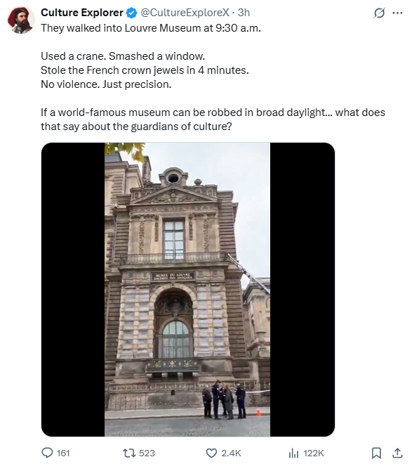 在公众开放时间发生的白天抢劫案非常罕见。在有游客在场的情况下在卢浮宫内作案,堪称欧洲近代史上最大胆的抢劫案之一,至少是自2019年德累斯顿绿穹珍宝馆被盗以来最引人注目的案件。