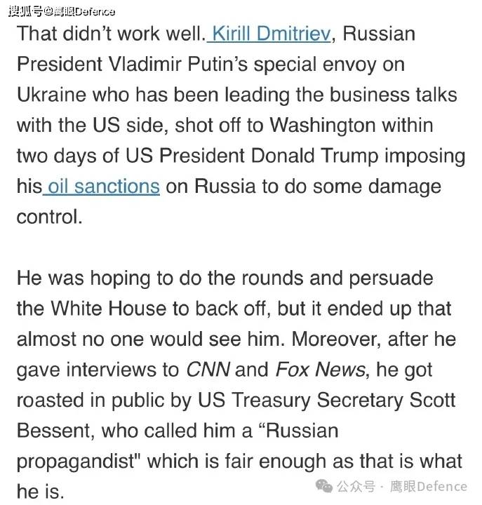 事实上,德米特里耶夫还在华盛顿受到了羞辱,美国财长贝森特在接受CBS电视节目《面对国家》采访时,称俄罗斯正感受到美国制裁的痛苦,指出印度等国已经在减少购买俄罗斯石油;对德米特里耶夫宣称制裁不会影响俄罗斯的说法,贝森特直接将德米特里耶夫称之为“宣传员”。