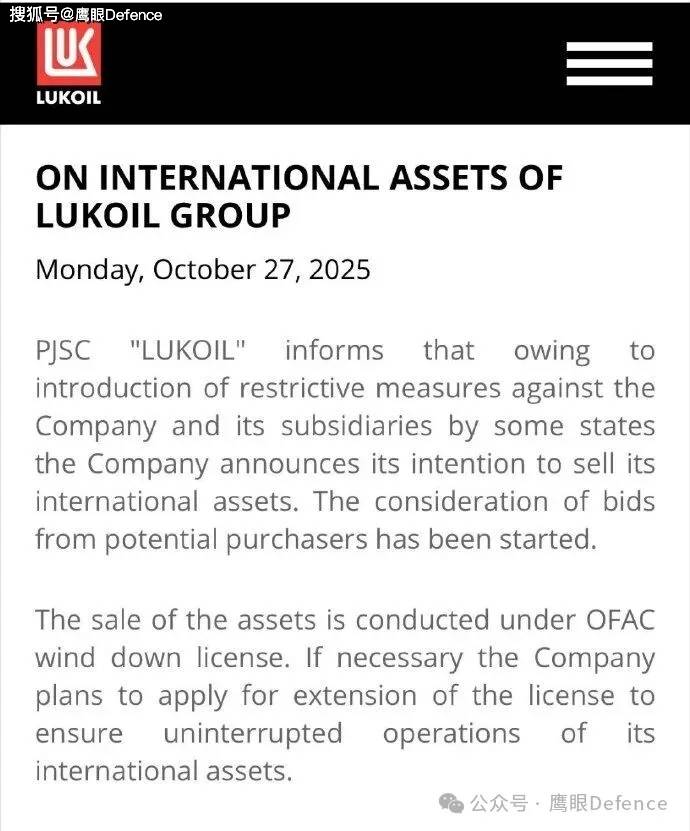 周一晚间,卢克石油发布了一份声明,为其海外企业寻找买家,包括位于罗马尼亚、保加利亚和荷兰的炼油厂,“由于一些国家对卢克石油及其子公司采取了限制措施,卢克石油宣布有意出售其国际资产”,竞标程序已经启动。