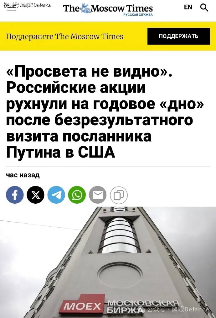 事实比美媒的评论更糟糕,《莫斯科时报》报道称,在德米特里耶夫的华盛顿之行以失败告终后,俄股已跌至年度低点,与稍早前普京给特朗普打电话后的表现完全不一样。