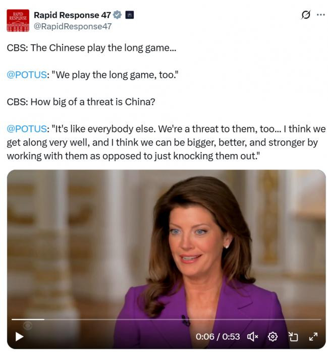 2025年11月2日,美国总统川普(Donald Trump)接受哥伦比亚广播公司(CBS)60分钟时事杂志(60 Minutes)专访。当被问到中国对美国的威胁有多大时,川普表示,中美现时相处得很好,他认为透过与中国合作,而不仅仅是击败他们,美国可以变得更强大、更优秀、更优秀。(X@RapidResponse47)