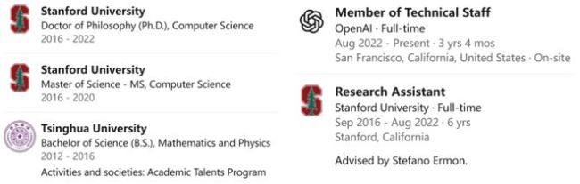 2022年6月毕业后就加入了OpenAI技术团队。工作经验仅有3年的他,履历上已有了多项辉煌战果。