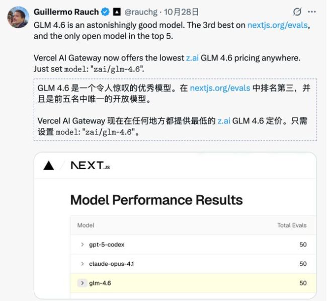 比如Vercel的老板Guillermo Rauch就表示,鉴于GLM-4.6的出色表现,「在nextjs.org/evals中排名第三,并且是前五名中唯一的开源模型」。