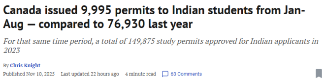 National Post获悉,今年1月至8月底,印度申请人总共获得了9,955份学生许可。相比之下,2023年同期为149,875份,去年同期则为76,930份。