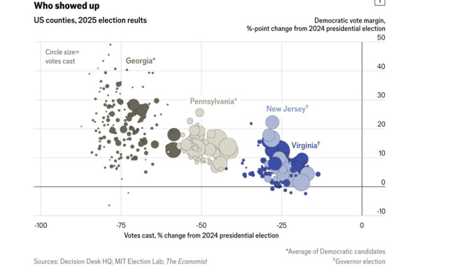 但11月4日举行的选举——也是明年中期选举前的最后一次,让民主党重新露出笑容。如今尘埃落定,《经济学人》的数据团队深入分析结果,探讨这是否意味着川普和共和党面临更大的麻烦。