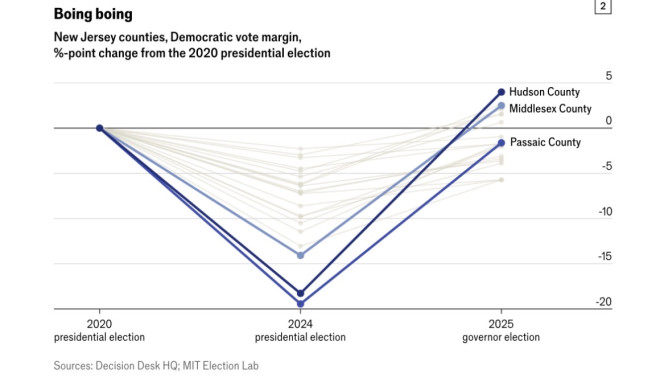 地方选举结果揭示了摇摆最大的地区。新泽西州的帕塞克县和哈德逊县在去年分别右转19和18个百分点,如今却出现了全州最显著的左转,支持新当选的民主党州长雪莉尔。