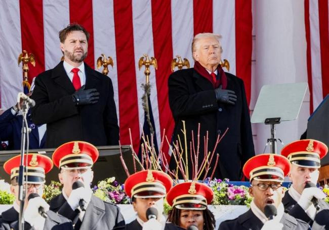 川普总统(后右)与副总统范斯(后左)11日参加维州阿灵顿国家公墓举行的退伍军人节典礼。(路透)