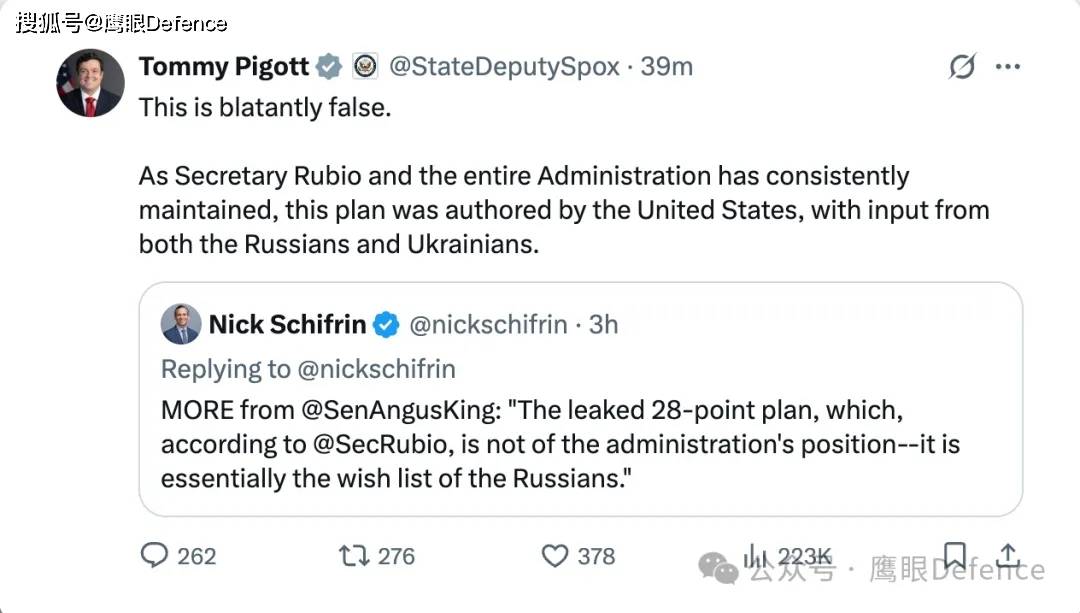 即便是辩解,也是充满谎言,特朗普依然在撒谎,卢比奥依然在撒谎,万斯依然在撒谎,美国国务院副发言人宣称“28点”是由克里姆林宫制定后再交给特朗普的说法不实,“是赤裸裸的谎言”,“正如卢比奥国务卿及整个政府始终坚持的立场,该计划由美国起草,并吸纳了俄乌双方的意见”。