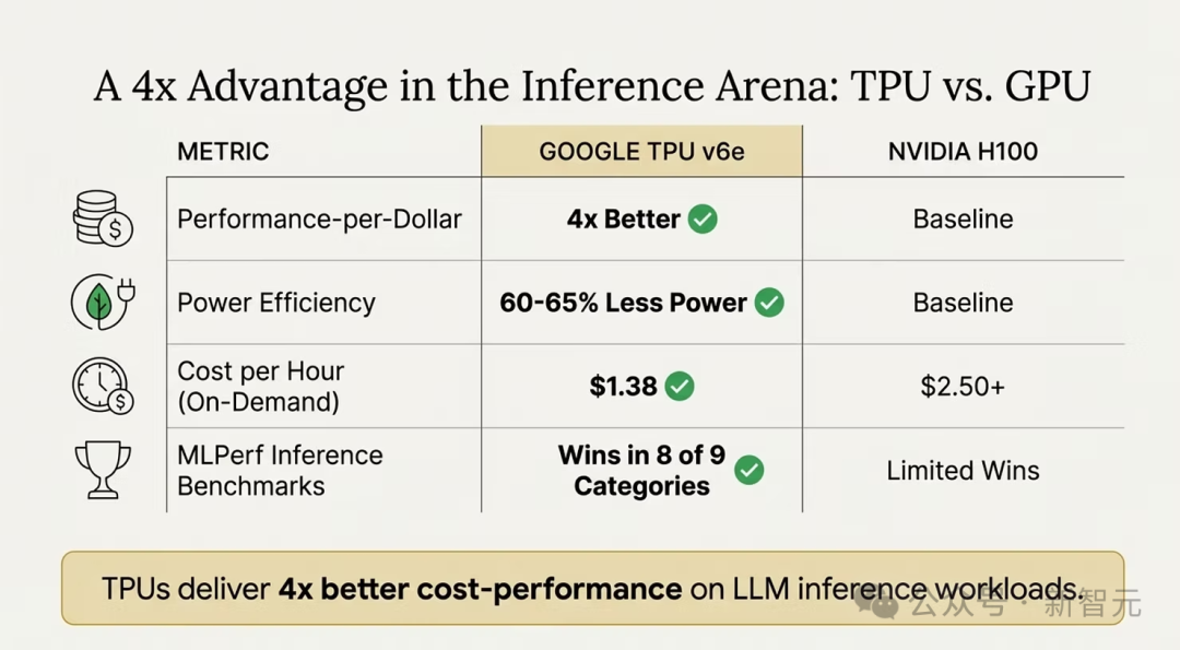 在性能、功耗、成本、基准测试等多个维度,谷歌的TPU v6e全面领先于英伟达H100,尤其在「性价比」(cost-performance)这一核心指标上优势显著。