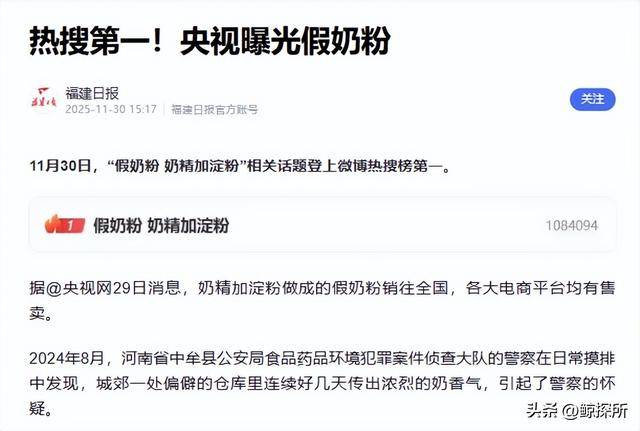 11月30日“假奶粉,奶精加淀粉”的话题直接冲上微博热搜第一,短短半天话题阅读量就破亿。