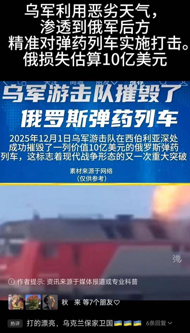 这一次,俄罗斯遭受的损失格外严重。据媒体报道,2025年12月1日,乌克兰的游击队成功摧毁了一列价值10亿美元的俄罗斯弹药列车,地点位于西伯利亚的深处。这一事件标志着现代战争的又一重大进展。虽然这并不是俄罗斯单次遭遇的最大损失,但摧毁西伯利亚的这列弹药列车所带来的冲击力度却是前所未有的。之所以如此,主要原因在于西伯利亚被认为是俄军的纵深后勤核心区域,这次攻击突破了这一安全防线,震动了俄罗斯的后方。此次事件暴露了俄罗斯纵深防御系统中的严重漏洞,也摧毁了俄罗斯认为本土后方绝对安全的神话。列车中载有俄罗斯冬季攻势所必需的战略弹药,包括巡航导弹部件和精确制导炮弹等重要物资。损失的直接后果是,前线的火炮日均发射量减少了40%,冬季攻势也因此遭遇了重大的打击。这种打击的效果远超单纯装备的损失。此外,俄军80%的战略物资都依赖西伯利亚铁路运输,而这次袭击切断了这一关键的补给链,预计在2到3周内无法恢复,这也意味着俄罗斯的进一步损失不可避免。此次打击不仅对俄乌谈判产生了巨大影响,还极大鼓舞了乌克兰军队的士气。