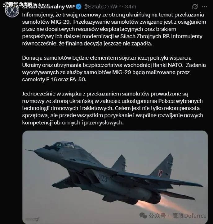 波兰武装部队总参谋部宣布,正在与乌克兰方面谈判,波兰准备向乌克兰提供剩余的全部米格-29战斗机,作为补偿,乌克兰则向波兰提供其已经实战检验过的部分无人机技术和导弹技术,“目的不仅是补偿设备,更重要的是获得并共同发展新的防御和工业能力”。