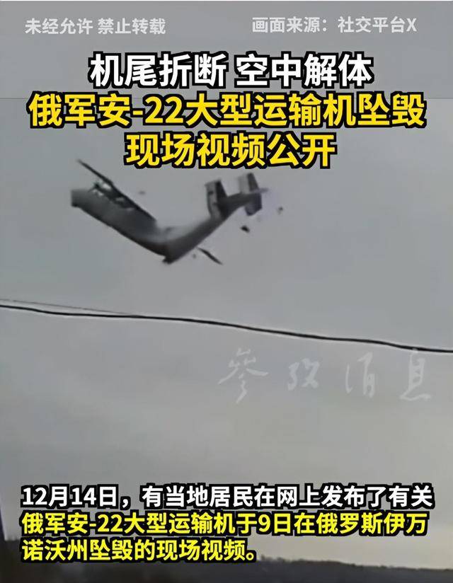 据参考消息,12月14日,有当地居民在网上发布了有关俄军安-22大型运输机于9日在俄罗斯伊万诺沃州坠毁的现场视频。