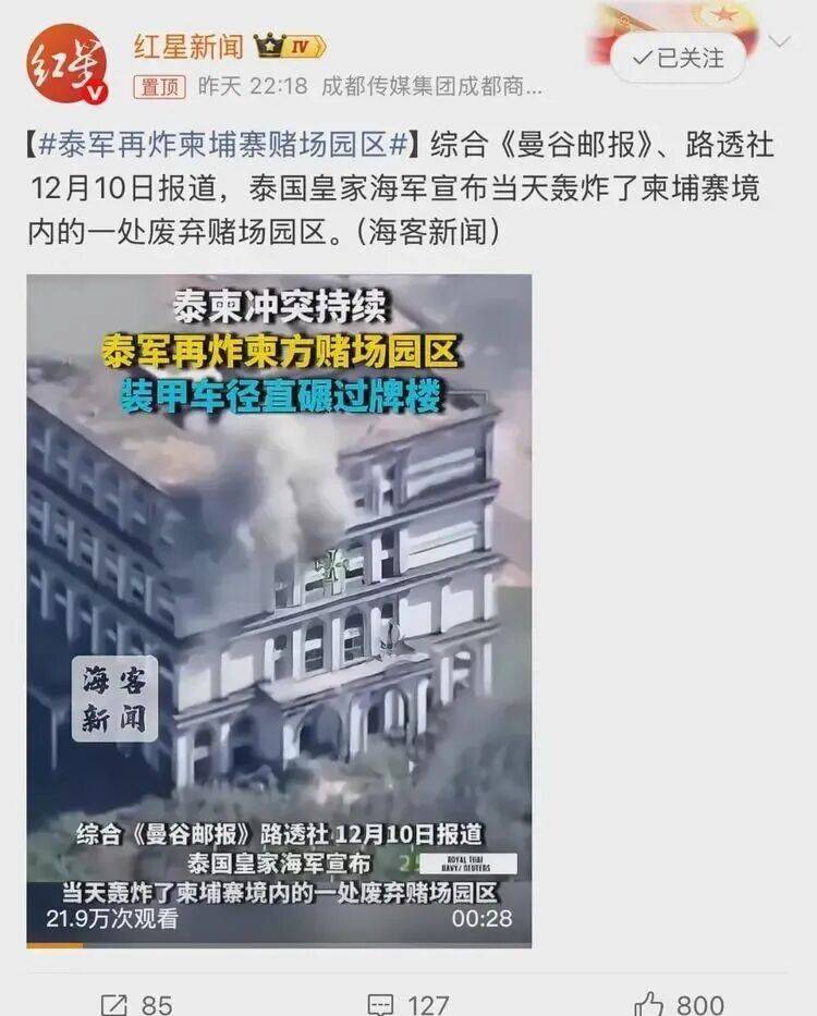这已经不是泰国第一次动手了。过去一周,泰国直接动用美国和瑞典供应的战机,连炸了柬埔寨 3 座赌场。别以为这些赌场只是赌钱的地方,它们早就是边境线上最扎眼的 “电诈堡垒”—— 白色围墙在绿森林里格外显眼,地下室堆着 BM-21 火箭炮的炮弹,高层房间成了无人机指挥中心,连电诈分子用来骗人的话术本、假发套,都和军火堆在一起。