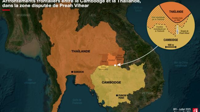 柬埔寨和泰国在有争议的柏威夏地区发生边境冲突。 © FMM Graphic Studio