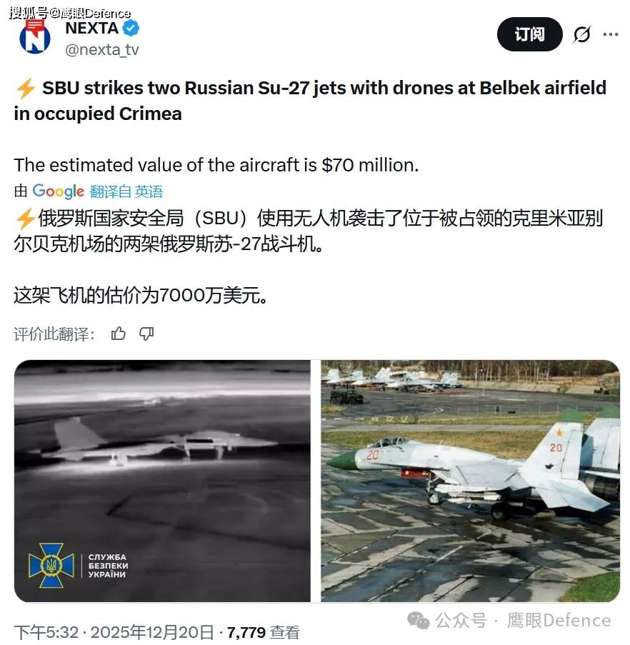 当地时间12月20日凌晨,乌克兰安全局下属“阿尔法”特战中心再次攻击了克里米亚的别尔贝克军用机场,两架苏-27重型战斗机被击毁,其中一架苏-27已满载弹药进入滑行道,准备起飞执行防空拦截任务,但终究是尚未起飞就被炸毁在了地面上。本次攻击顺带还击中了别尔贝克机场的调度塔。